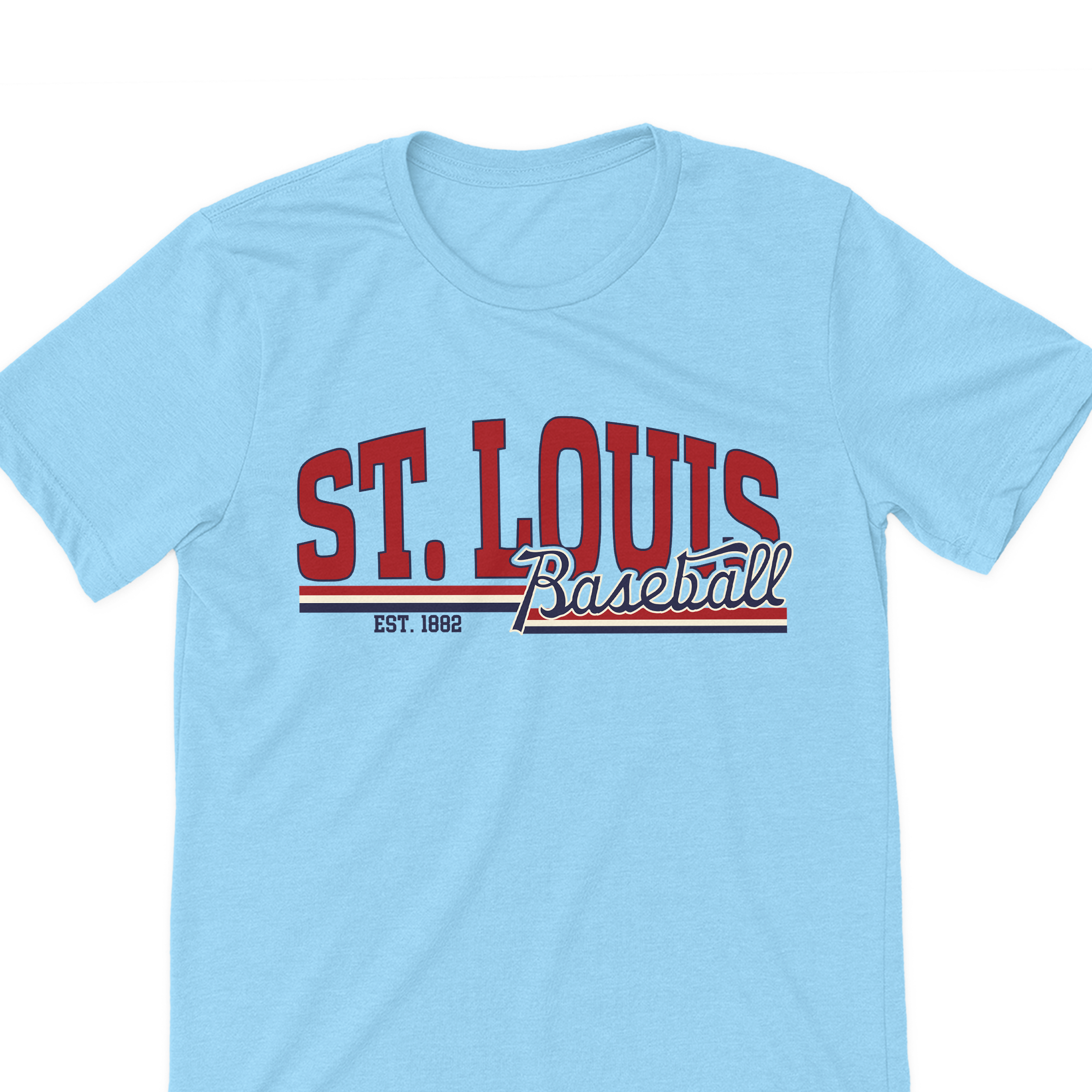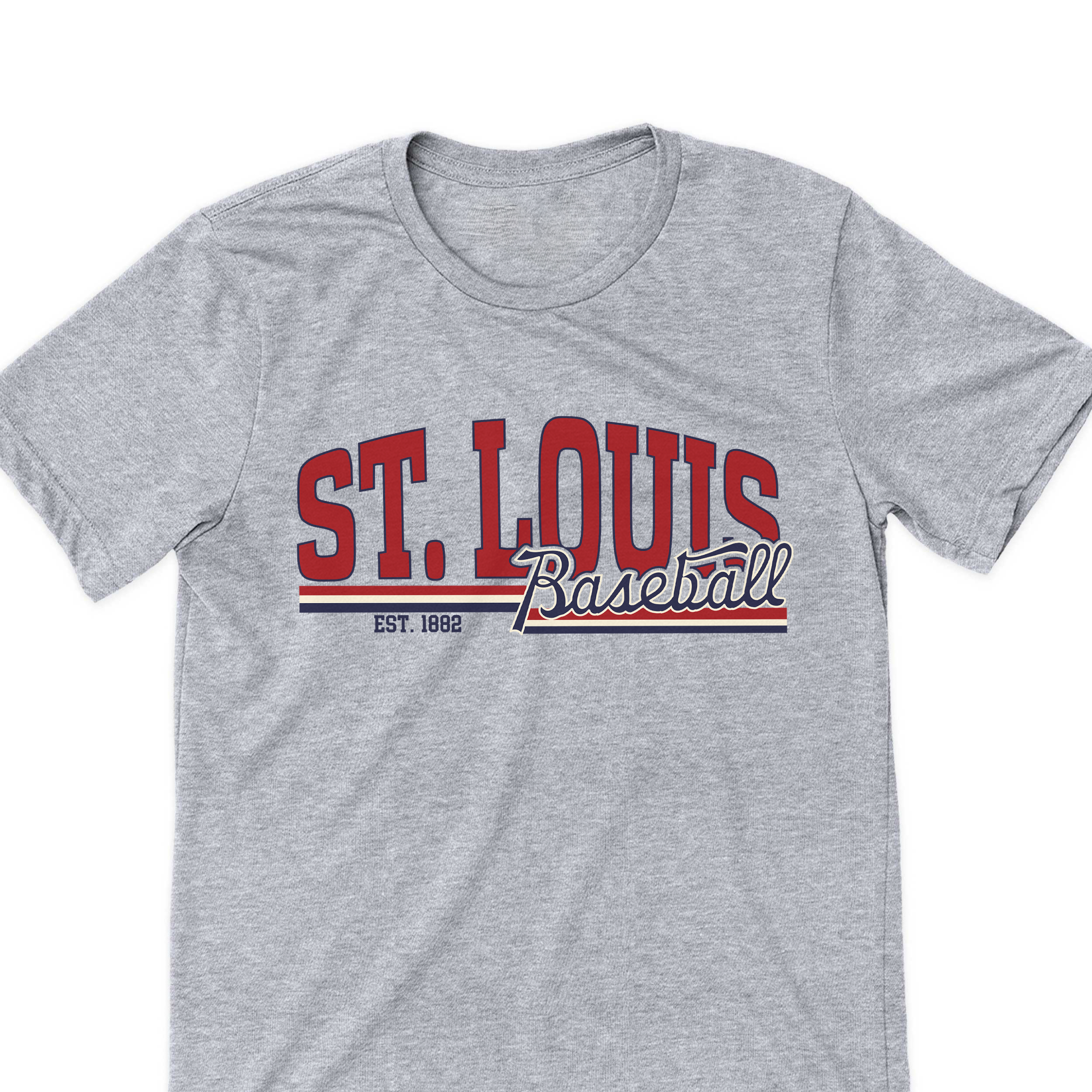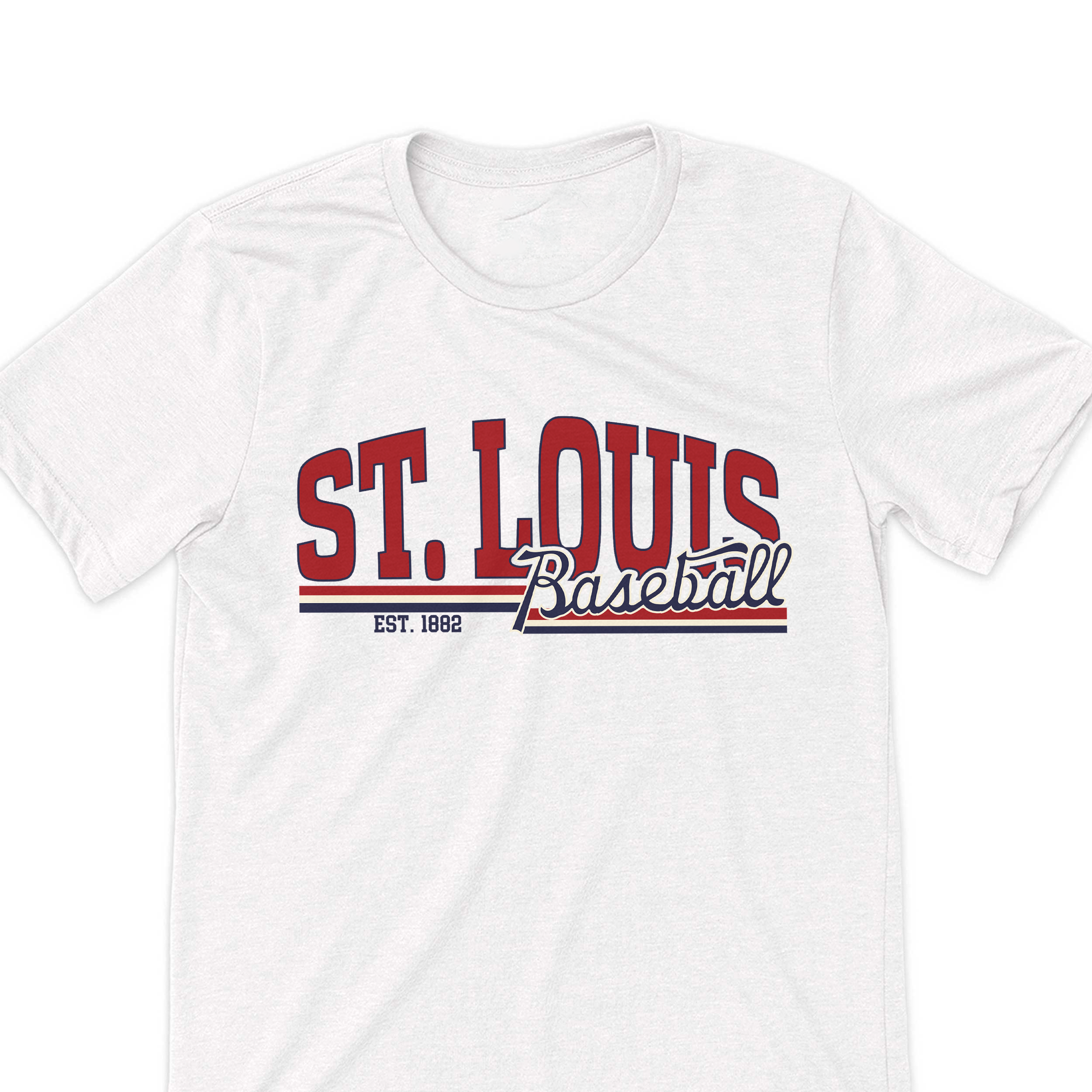 Clean, classic, and built for true STL fans—this design brings timeless baseball style with a bold, modern edge. Featuring oversized varsity “ST. LOUIS” lettering paired with a vintage-inspired script “Baseball,” this piece layers iconic red, cream, and navy for that perfect throwback feel.