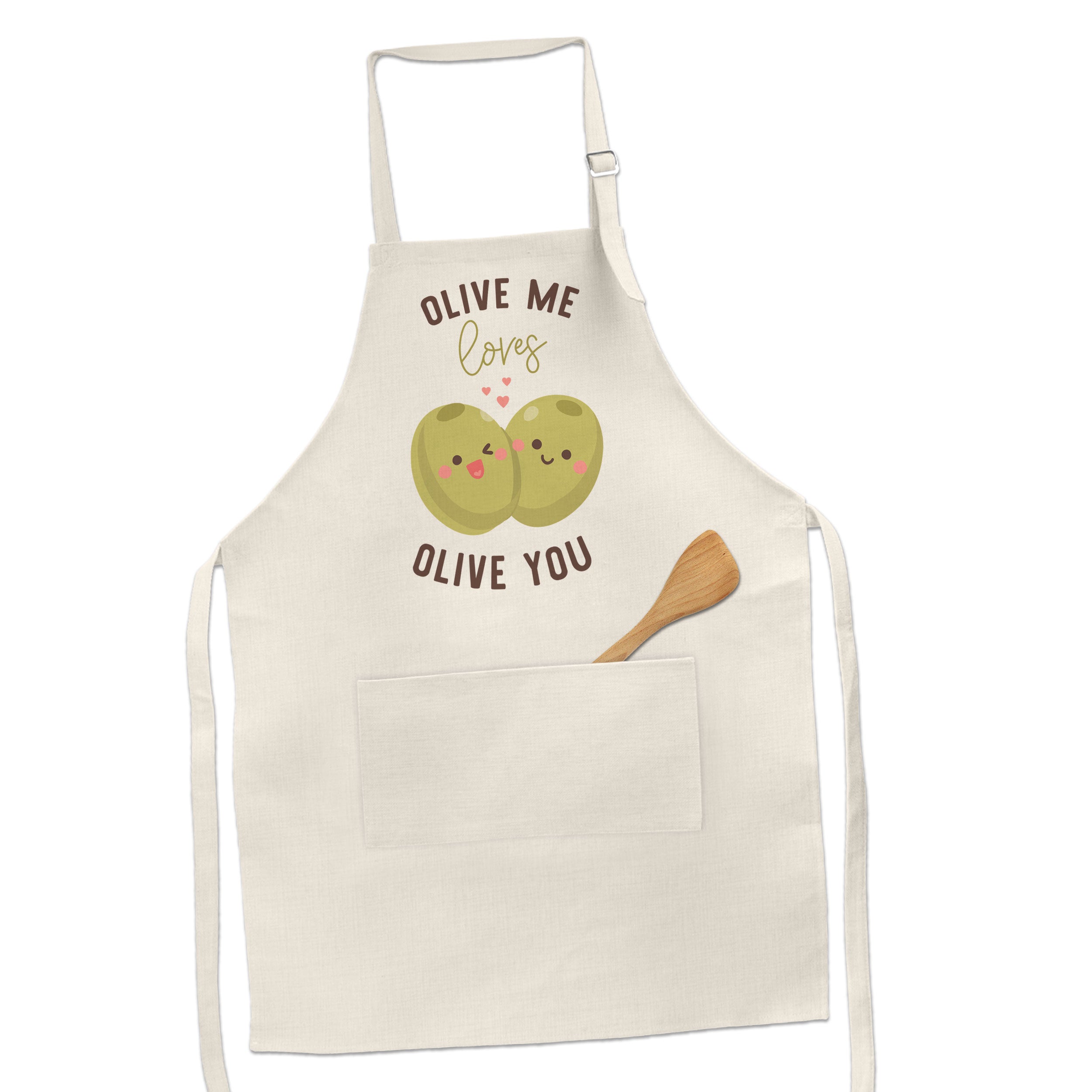 Olive me loves olive you design on this linen adult 2 pocket bib apron makes a great hostess / party gift and fun to display during this LOVE season!